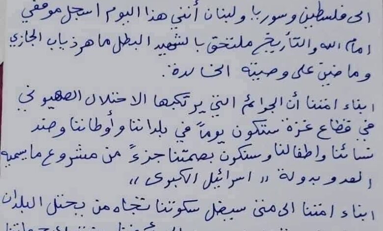 صدر عن ذوي الشهيد عبد المطلب حسن محمد القيسي، وبالنيابة عن أقاربه وأبناء عمومته، بيان يوضح موقفهم وينفي ما نُسب إليه من وصية، وجاء بالبيان: